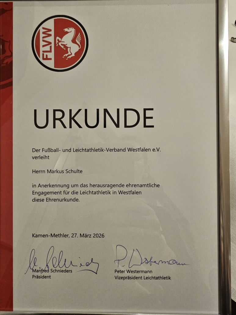 Markus Schulte wurde vom Fußball und Leichtathletik Verband Westfalen mit einer Ehrenurkunde ausgezeichnet. Gewürdigt wurde damit sein langjähriges und herausragendes Engagement in der Leichtathletik.