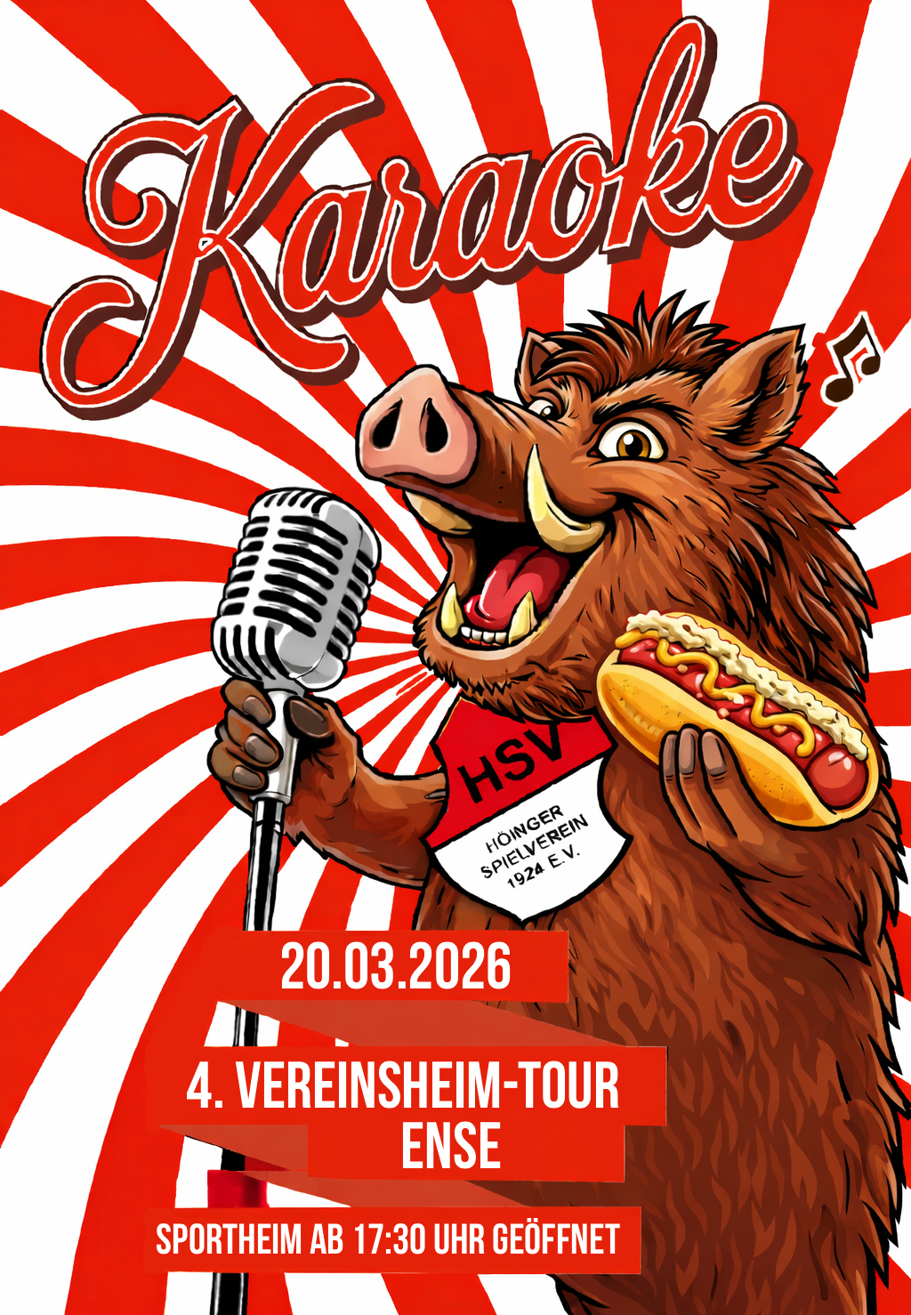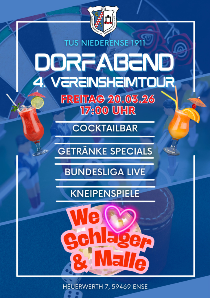 Es geht wieder los. Am 20. März 2026 startet die 4. Vereinsheim Tour in Ense. Die Sportheime der Enser Vereine öffnen ihre Türen für einen gemeinsamen Abend mit Musik, Essen und Getränken. Im Höinger Sportheim wartet wieder die Karaoke Maschine auf euch 🎤. Dazu gibt es frischen Hot Dog und kühle Drinks 🍻🥂. Wer Lust […]