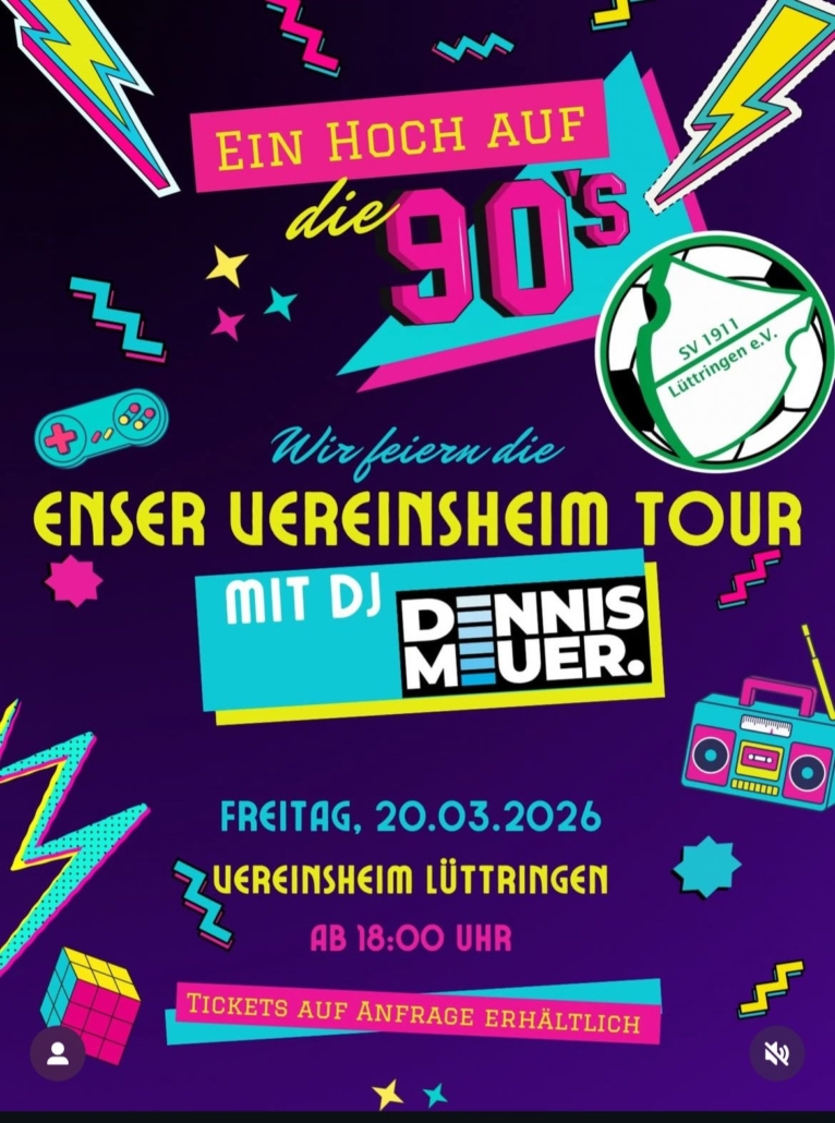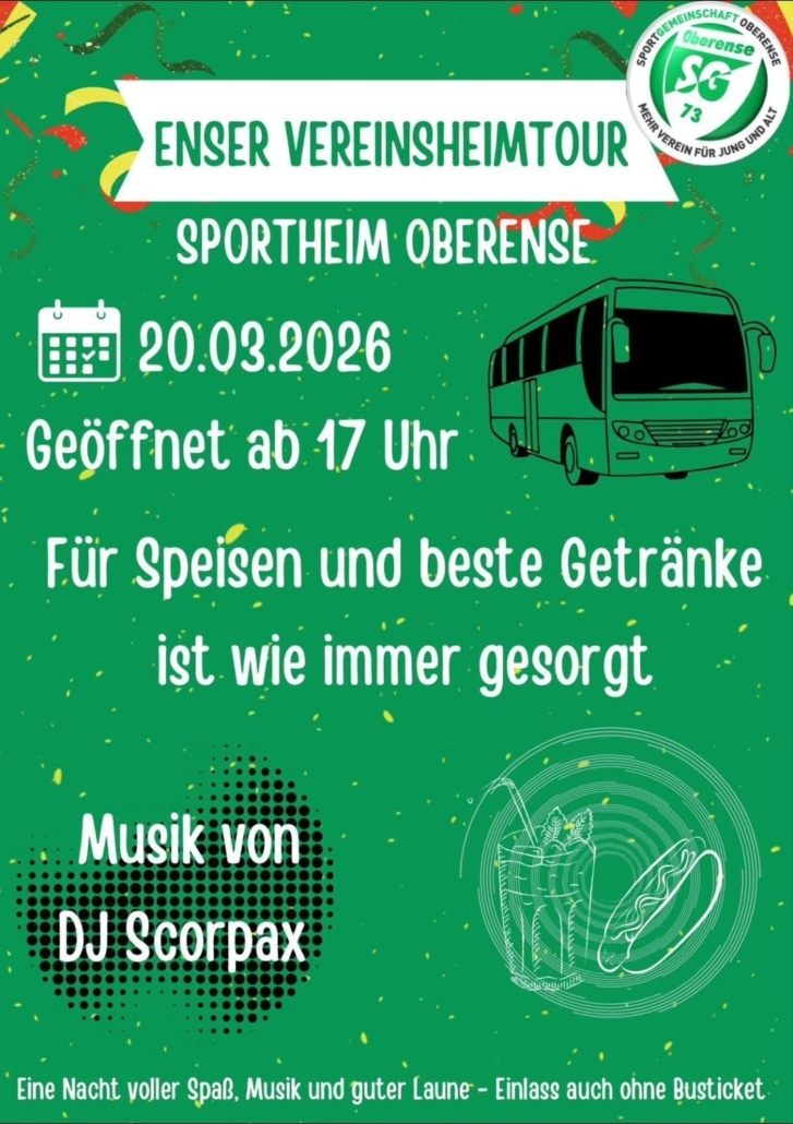 Nach den erfolgreichen Touren der letzten Jahre geht die Enser Vereinsheim-Tour in die dritte Runde! Am 28. März 2025 öffnen erneut die Sportheime der Enser Vereine ihre Türen und laden zu einem geselligen Abend mit Musik, Speisen und Getränken ein. Mit dabei sind wieder:⚽ Höinger SV⚽ TuS Bremen⚽ TuS Niederense⚽ SG Oberense⚽ SF Waltringen⚽ SV […]