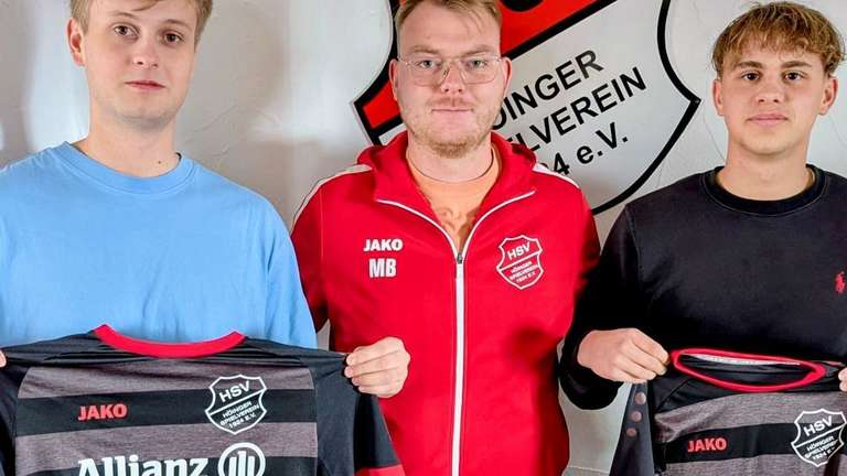 Marwin Bange aus der Sportlichen Leitung des HSV (Mitte) heißt die Neuen Hanno Schulte (links) und Sullivan Schinow in Höingen willkommen. © Sebastian Heinke, Soester Anzeiger