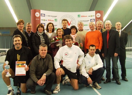 Gelungene 32. Westfälische Hallenmeisterschaften beim TC Blau-Weiß Werne: (v. li. knieend) Nicolae Isbasescu (Sieger Herren 55, Höinger SV 1924), Claus Weinforth (Sieger Herren 50, TC Haus Wittringen), Lutz Rethfeld (Sieger Herren 45, THC Münster), Kai Hoffmann (Sieger Herren 40, TC GW Mesum); (v. li. stehend) Jutta Rogalla-Oesterschulze (Wernes stellvertretende Bürgermeisterin), Gerd Schobert (WTV-Referent der Senioren), Renate Hennes (WTV-Referentin der Seniorinnen), Barbara Kunert (Siegerin Damen 40, THC Münster), Brigitte Steinhorst (Siegerin Damen 55, TC Siegen), Eckart von Salis (Sieger Herren 60, TC St. Mauritz), Gabi Schneider (Siegerin Damen 50, TC Hohenstein Witten), Heiner Eymer (Sieger Herren 65, TC GW Lippstadt), Horst Bunge (Sieger Herren 75, TC Kamen-Methler), Rudolf Perplies (Sieger Herren 70, TV Espelkamp-Mittwald) WTV-Präsident Robert Hampe, Arnd Grotjohann (Kommissarischer WTV-Vizepräsident Sport).